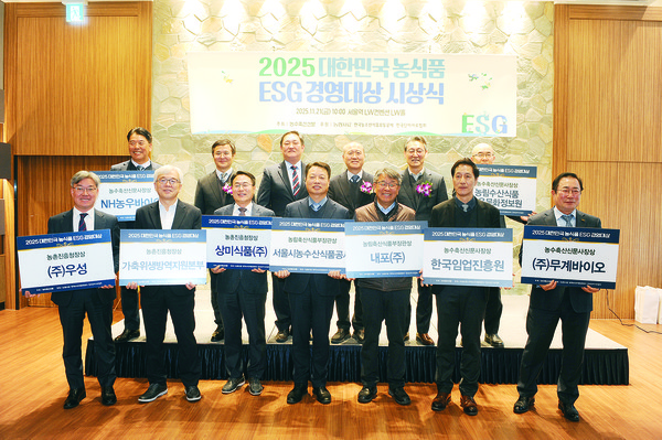 [농수축산신문=이한태·이문예·김진오·박세준 기자] 농업회사법인 내포(주)와 서울시농수산식품공사가 올해 농식품 분야에서 가장 적극적으로 환경·사회·지배구조(ESG) 경영 활동을 펼치며 모범이 된 경영체로 선정됐다.지난 21일 서울 중구 소재 LW컨벤션 LW홀에서 본지 주최, 농림축산식품부·농촌진흥청·한국농수산식품유통공사·농협사료·한국단미사료협회 후원 아래 ‘2025 대한민국 농식품 ESG 경영대상 시상식’을 개최했다.올해는 내포(주)와 서울시농수산식품공사가 영예의 대상인 농식품부장관상을 수상했으며, 최우수상인 농진청장상에 가축위생방역