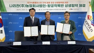 [농수축산신문=김진오 기자]한국식품산업클러스터진흥원(이사장 김덕호)은 지난 17일 전북 익산 본원에서 나리찬주식회사농업회사법인(대표 문성호), 왕궁작목반(회장 류형규)과 ‘익산 지역 농산물을 활용한 김치 제조 협력을 위한 상생협약’(MOU)을 체결했다고 밝혔다.협약식에는 이명남 식품진흥원 사업본부장, 문성호 나리찬 대표, 류형규 왕궁작목반 회장을 비롯한 관계자들이 참석했다.이번 협약은 지역 농산물 상호 협력을 통해 농업경제를 활성화하고 식품산업의 경쟁력을 강화하는 것이 목표다.협약에 따라 나리찬은 왕궁작목반에서 공급하는 익산 농산물