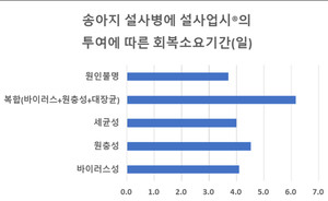 한우와 젖소 송아지의 설사병에 ‘설사업시®’를 투여한 결과 시험기간 동안 폐사축이 없고 증상도 개선되는 등 회복효과가 있는 것으로 나타났다. SMP동물약품은 국내 한우와 젖소 각각 두 농가에서 사육되고 있는 송아지 설사병 발생축 94마리에 설사업시®를 투여해 한달 간 조사한 결과, 회복에 소요되는 기간이 한우의 경우 3.75일로 젖소 4.28일에 비해 빠른 경향을 보였다고 밝혔다.또한 원인체별 소요 기간을 비교한 결과, 바이러스성이 4.1일로 원충성 4.6일, 복합성 6.2일에 비해 빠른 회복 경향을 나타냈다. SMP 관계자는 “설