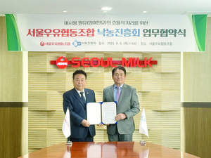 [농수축산신문=김신지 기자]서울우유협동조합(조합장 문진섭)과 낙농진흥회(회장 김선영)가 지난 6일 미사용 원유의 효율적 처리를 위해 분유처리 시설을 공공개념으로 활용할 수 있는 업무협약(MOU)을 체결했다.이번 협약은 최근 국내 원유 수급의 불균형과 미사용 원유 발생에 따른 처리 부담을 완화하고 원유 자원의 효율적 활용을 통한 낙농산업의 지속가능한 발전 기반을 구축하기 위해 마련됐다.양 기관은 이번 협약을 통해 △전국단위 미사용원유 예측·관리 △분유제조 설비 가동을 통한 미사용원유 처리 등을 공동으로 추진하기로 했다.낙진회는 전국단