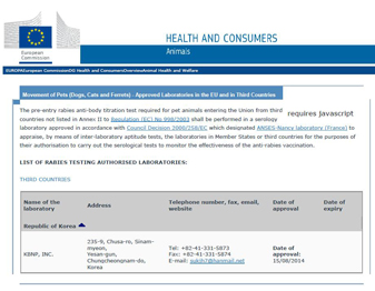 고려비엔피는 지난 15일자로 유럽연합(EU) 집행위원회 보건소비자총국으로부터 대한민국 광견병 항체가 검사기관으로 인증받았다고 밝혔다. 이번 검사기관인증으로 고려비엔피가 실시한 개 및 고양이의 광견병 항체가 검사결과는 유럽연합(EU)에 가입된 모든 국가에서 공식적인 결과로 인정된다.