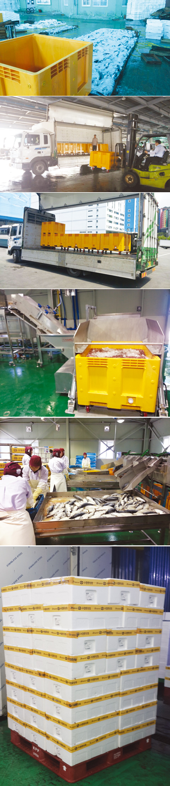 부산공동어시장에서 낙찰된 고등어는 수협이 자체제작한 노란색 박스에 얼음과 함께 담겨진다.