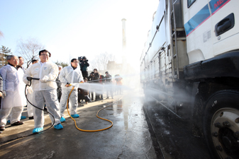 <사진설명> 이동필 농식품부 장관(사진 맨 앞)과 이기수 농협 축산경제대표(사진 뒤쪽)가 농협부천축산물공판장 출입차량을 소독하고 있다.