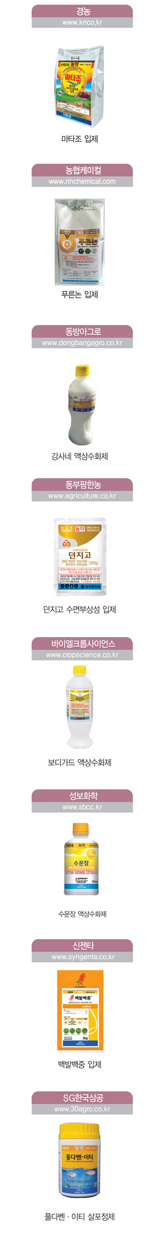 푸른논 입제는 올해 신제품으로 메타조설퓨론과 펜트라자마이드 성분을 함유해 저항성 피 등 잡초에 효과가 뛰어난 중기일발처리제초제다. 특히 올방개 등 다년생잡초 방제 효과가 우수하며 괴경까지 고사시켜 잡초 밀도를 줄여준다.