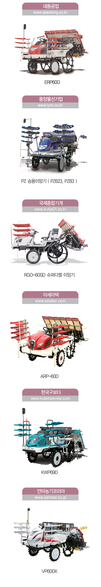 이러한 추세에 맞춰 승용이앙기는 임작업용으로 인기가 높은 6조식이 대세를 이루고 있으며 힘과 내구성을 앞세우는 디젤 승용이앙기의 보급이 크게 늘고 있다.