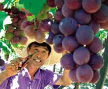 찌는 듯한 더위가 다시 시작된 16일 경기 안성의 한 포도농장에서 농가가 탐스럽게 익은 거봉포도를 수확하고 있다. 거봉포도는 가락시장에서 중품 4kg 상자당 1만3000원에 경매되고 있다.