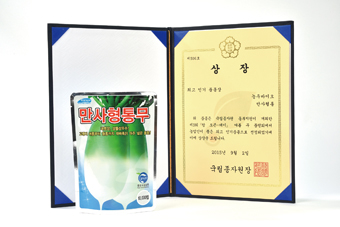 농우바이오의 만사형통무가 국립종자원 동부지원이 최근 개최한 제3회 ‘팜 오픈-데이’ 여름무 품평회에서 대상인 ‘최고 인기 품종상’을 2년 연속 수상하는 영예를 안았다.