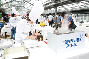 시연회에는 제주에서 재배 중인 여주, 공심채 등 아열대 채소 15종을 이용해 경기대학교 외식조리학과 김명희 교수팀과 전문 셰프들이 개발한 김치(깍두기), 볶음, 샐러드, 디저트 등 20여가지 요리가 소개됐다.