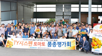 농우바이오는 지난달 29일 충남 부여군 세도면 송정훈 씨 농장에서 전국의 주요 토마토 재배농가, 육묘장, 유통인 등 100여명이 참석한 가운데 TY시스펜 토마토 품평회<사진>를 열었다.