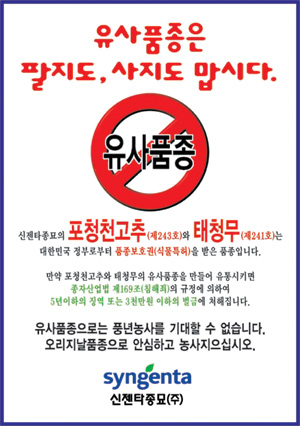 신젠타종묘측은 품종보호권을 획득한 포청천고추(243호)와 태청무(241호)가 농민들 사이에 인기가 높아지자 일부 종자업체에서 유사품종을 만들어 유통시킬 것으로 판단, 유사품종 유통시에는 법적인 처벌을 받을 수 있다는 포스터를 제작했다.