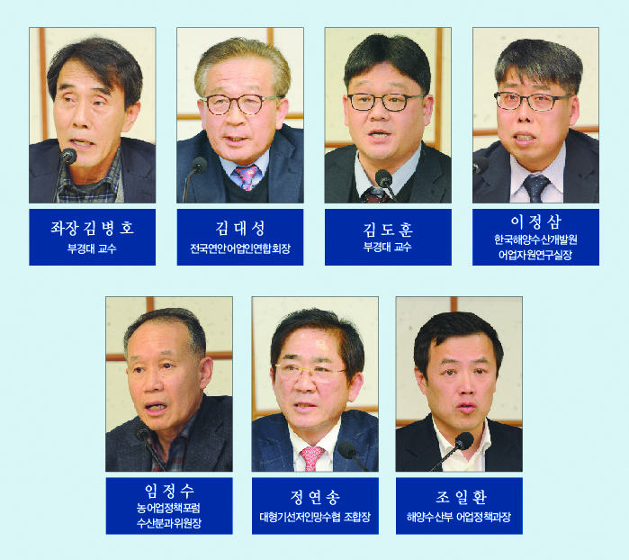 △지정토론자 : 김대성 전국연안어업인연합회장, 김도훈 부경대 교수, 이정삼 한국해양수산개발원 어업자원연구실장, 임정수 농어업정책포럼 수산분과위원장, 정연송 대형기선저인망수협 조합장, 조일환 해양수산부 어업정책과장 (가나다 순)
