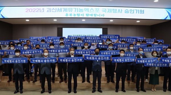 농협충북지역본부(본부장 염기동)가 2022년 괴산세계유기농산업엑스포 행사승인을 위해 지난 15일 농협지역본부 대회의실에서 직원 100여 명이 참석한 가운데 조창희 과장(괴산군청 유기농정책과)에게 행사계획에 대한 설명을 듣고, 승인기원식을 가졌다.