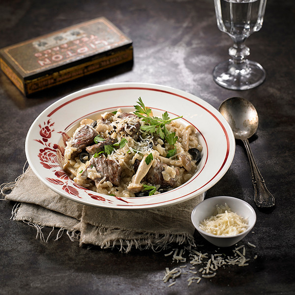 먼저 후라이팬에 올리브유를 충분히 두르고 마늘과 양파를 넣고 볶다가 버섯도 함께 넣어준다. 적당히 익으면 쌀도 함께 넣고 볶다가 사골국물을 넣고 함께 끓여준다. 쌀이 어느 정도 익으면 채끝과 채 썬 블랙올리브, 생크림, 우유, 소금, 후추를 넣고 익히면서 걸쭉하게 농도를 맞춰주면 한우 사골 리조또 완성.