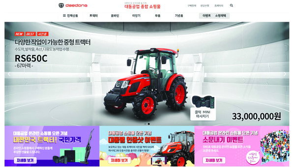 대동공업은 정찰가의 농기계를 온라인에서 쉽게 구매할 수 있는 ‘대동공업 쇼핑몰(mall.daedong.co.kr)’<사진>을 오픈했다고 밝혔다.