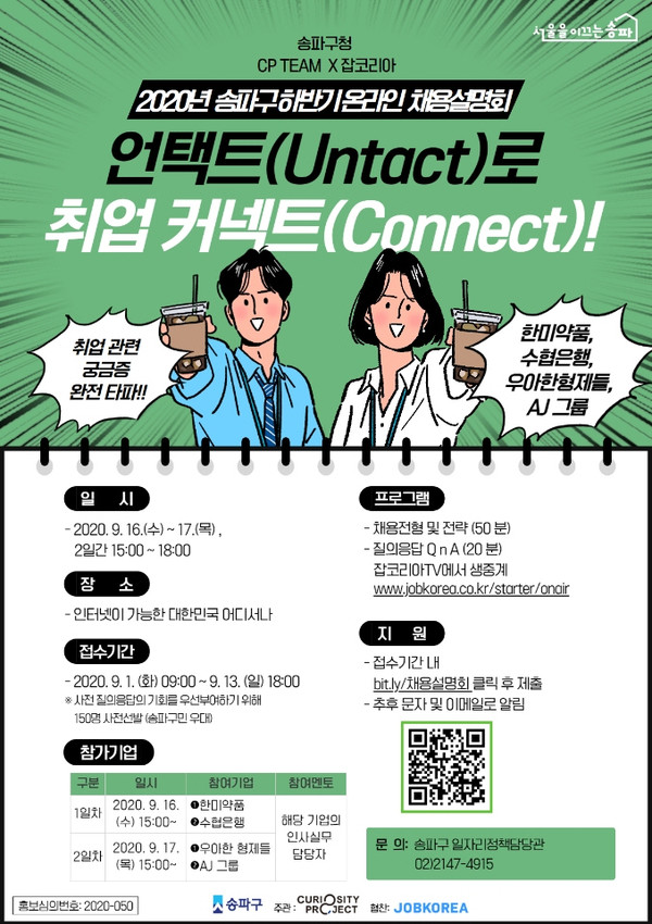 이번 채용설명회는 코로나19 국면이 장기화됨에 따라 구직자와 인사담당자의 대면상황이 없는 언택트 방식으로 진행되며 수협은행을 포함한 송파구 소재 기업들이 적극적으로 참여한다. 구직자의 참여방법은 1일부터 13일까지 사전 질의응답 기회를 우선 부여하기 위해 150명을 사전선발(송파구민 우대)하며, 기간 내 ‘bit.ly/채용설명회’로 지원하면 추후 문자와 이메일로 참여결과를 알려준다.