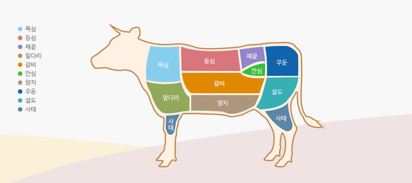 오랫동안 우리 식탁에 가까이 있던 한우지만, ‘한우를 어떻게 먹는가?’ 생각하면 구이, 불고기, 곰탕 등으로 즐겨먹는 한우 요리는 생각보다 한정적이다. 그러나 한우는 ‘일두백미(一頭百味, 한 마리에서 백 가지의 맛이 나온다)’라고 불릴 만큼 한우 한 마리는 대분할로는 10개, 소분할로는 39개의 부위로 나눠질 정도로 부위가 매우 다양하며, 각 부위마다 맛 또한 모두 다르다.