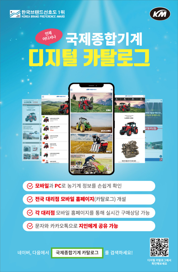 국제종합기계는 스마트폰과 컴퓨터로 트랙터,콤바인,이앙기,특판제품 등 농기계정보를손쉽게 확인할 수 있는‘디지털 카탈로그(국제.com)’를 오픈했다.