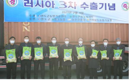 전남도농업기술원은(원장 박홍재) 최근 코로나19 장기화로 농산물 수출이 급격히 줄고 있는 가운데 완도에서 생산한‘자연그대로미’쌀 러시아 수출 기념행사를 신우철 완도군수를 비롯한 최고품질쌀 단지 농업인 등 50여 명이 참석한 가운데 완도농협연합RPC에서 가졌다. 이날 수출한‘자연그대로미’쌀 16톤은 NH농협무역을 통해 부산항에서 선적 후 러시아 사할린주에 있는 우즈베키스탄 쌀시장, 블라디보스토크 마트 등에서 판매된다. 이번에 수출되는‘자연그대로미’쌀은 현지에서 소비자들의 호응이 좋아 완도군은 지난해 러시아와 5년간 700톤 20억원 규모의 수출협약을 맺어 안정적인 수출판로를 확보했고, 러시아 다른 지역으로의 판매 확대도 추진하고 있다.