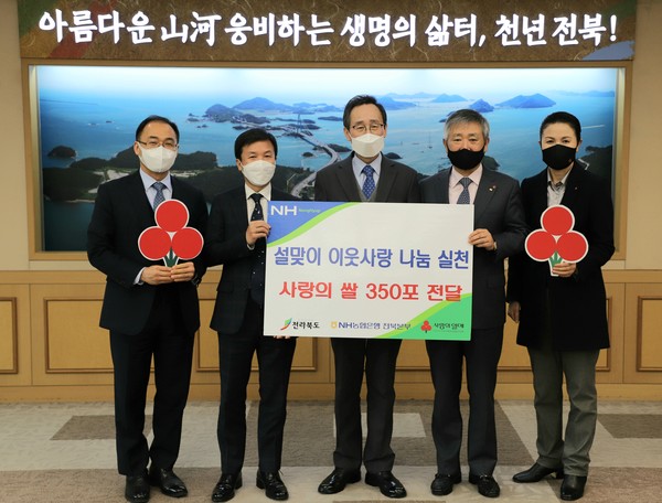 농협은행 전북영업본부(본부장 장기요)는 지난 5일 전북도청(도지사 송하진)을 방문해 설 명절맞이 사랑의 쌀 350포(3500kg)를 전달했다.