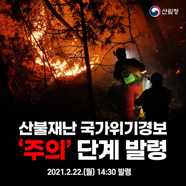산림청 중앙산불방지대책본부는 22일 전국에 산불재난 국가위기경보 ‘주의’ 단계를 발령했다. 이는 동해안과 영남권을 중심으로 건조주의보 발효가 계속되고 전국적·동시다발적으로 산불이 발생함에 따른 일이다.