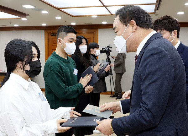 수협재단은 최근 서울 송파구 수협중앙회 본사에서 장학증서 수여식을 개최해 제9기 장학생들에게 장학증서와 기념품을 수여했다. 수여식에는 장학생 대표 윤민영 학생과 최인서 학생을 비롯해 권역별 대표 학생 8명이 참석했다. 선발된 장학생들은 대학생 200만 원, 고등학생 100만 원의 장학금을 수여받게 된다.