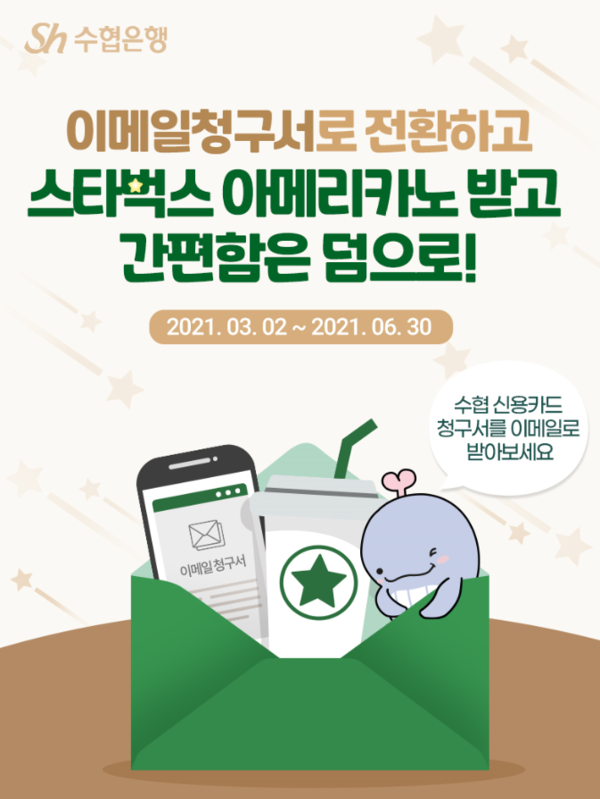 Sh수협은행은 개인 신용카드 명세서를 우편 수령에서 이메일 수령으로 변경하는 고객을 대상으로 ‘이메일(e-mail) 청구서 전환 이벤트’를 실시한다.