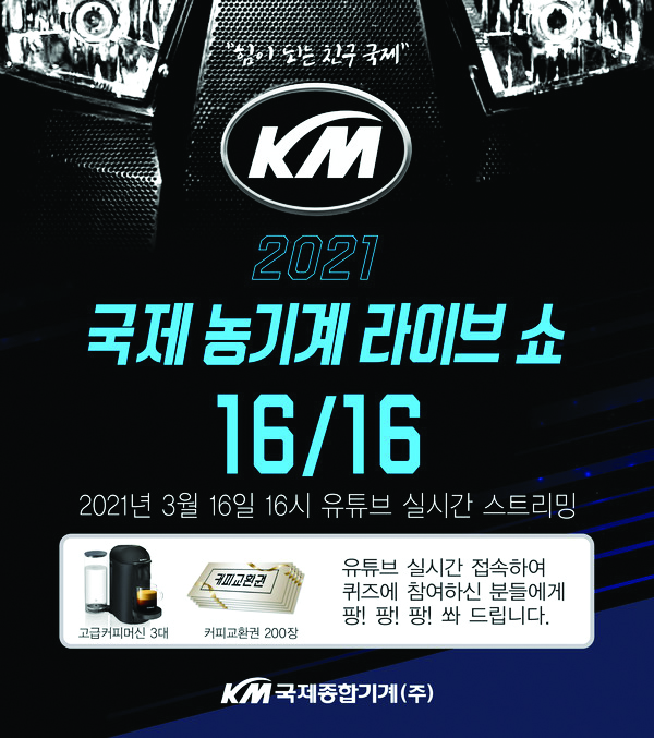 한편 농기계 라이브쇼(온라인 연전시)개최 기념이벤트로 다음달 30일까지 ‘농기계 라이브쇼 퀴즈, 유튜브 구독 이벤트’를 국제종합기계 공식 블로그에서 진행한다. 농기계라이브쇼 시청 후 이벤트 페이지에 댓글로 퀴즈 정답이나 국제종합기계TV 공식 유튜브 구독 인증사진을 댓글로 남기면, 추첨을 통해 사은품을 증정한다.