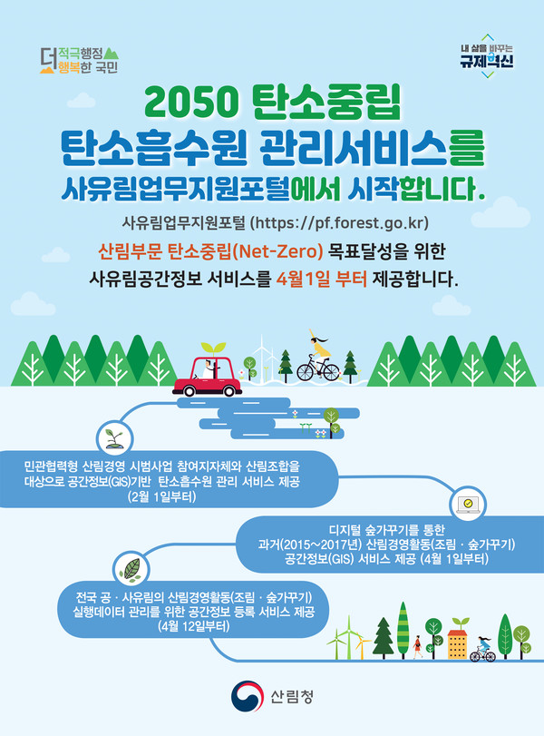 산림청은 사유림업무지원포털을 통해 2050산림부문 탄소중립 이행에 필요한 공·사유림의 산림경영활동(조림·숲가꾸기) 사업시행 정보서비스를 공간정보(GIS) 기반으로 관리할 수 있도록 지자체에 제공한다.