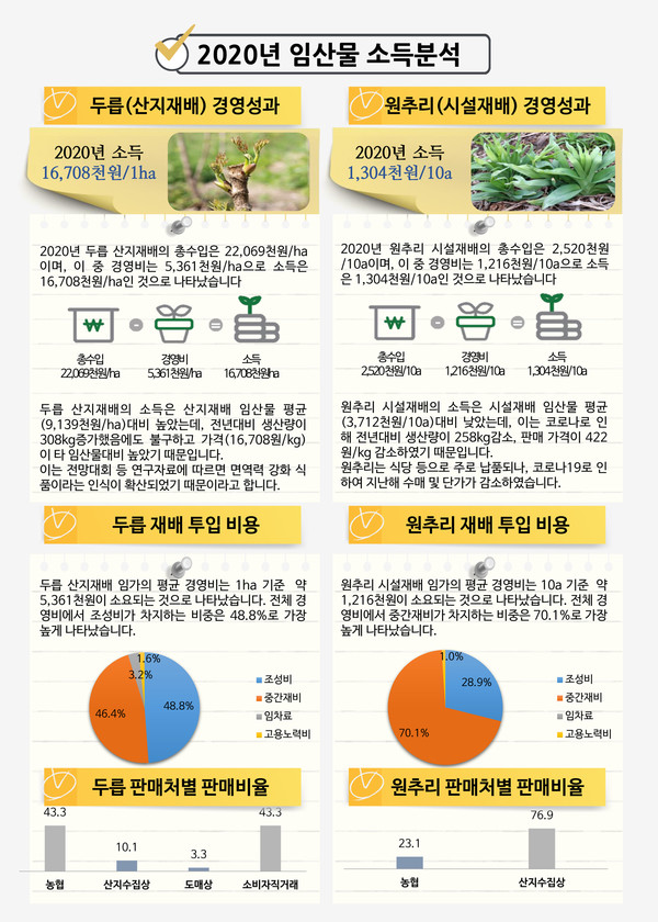 임산물 소득 조사는 2014년부터 매년 표본조사 및 방문조사 형태로 실시 하고 있다. 조사품목은 산채류 등의 임업경영계획 수립에 필요한 정보 조사를 통해 임가 소득증대를 위한 기초자료로 활용 된다. 품목과 재배유형에 따른 기준면적당 경영성과 조사 결과, 산지재배 품목은 산마늘, 농지재배는 산딸기, 시설재배는 참나물의 소득이 가장 높은 것으로 나타났다.