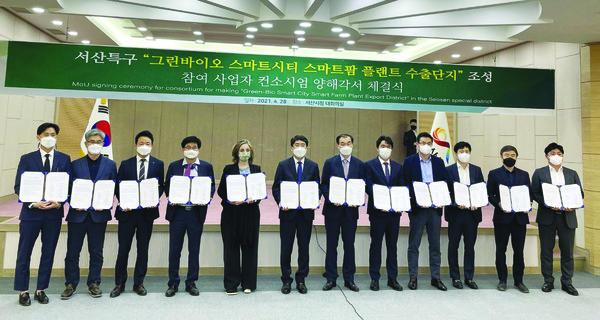경농은 충남 서산에 조성되는 그린바이오 스마트시티 스마트팜 플랜트 수출단지 조성사업에 관수와 스마트팜 공급자로 참여하기로 하고 지난달 28일 서산시청 대회의실에서 컨소시엄 양해각서를 체결<사진>했다.
