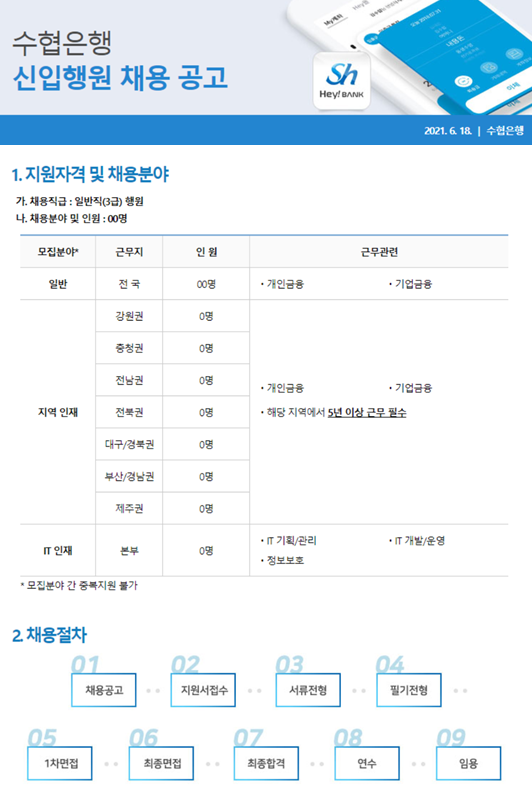 2021년 신입행원 공채 지원은 수협은행 채용 전용(사람인) 누리집(suhyup-bank.saramin.co.kr) 온라인 접수로만 가능하며 전형별 일정 등 보다 자세한 사항은 수협은행 홈페이지에서 확인할 수 있다.