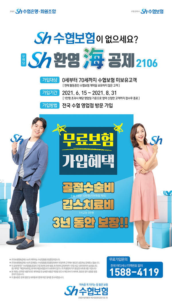 Sh수협보험이 오는 8월 말까지 수협보험 신규 고객들을 대상으로 ‘Sh환영海공제2106’ 무료 가입을 지원한다.