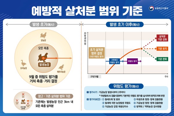 농식품부는 올 겨울부터 AI 발생 위험도 평가를 거쳐 초기 살처분 범위를 설정하고 2주마다 주기적으로 평가를 실시해 필요시 조정할 계획이다.