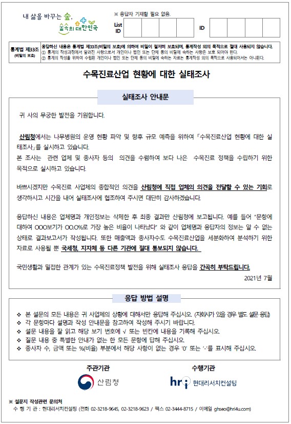 조사목표는 나무병원 운영 현황과 수목진료 산업의 규모 등을 파악해 수목진료 제도의 성공적인 안착을 도모하기 위해서다. 실태조사는 용역회사인 ㈜현대리서치컨설팅이 조사원들을 선발하여 사전교육한 후 직접 각 나무병원을 방문하는 대면방식과 코로나19 상황을 고려한 비대면 방식(전자우편·모바일 또는 전화 조사)으로 병행할 계획이다.