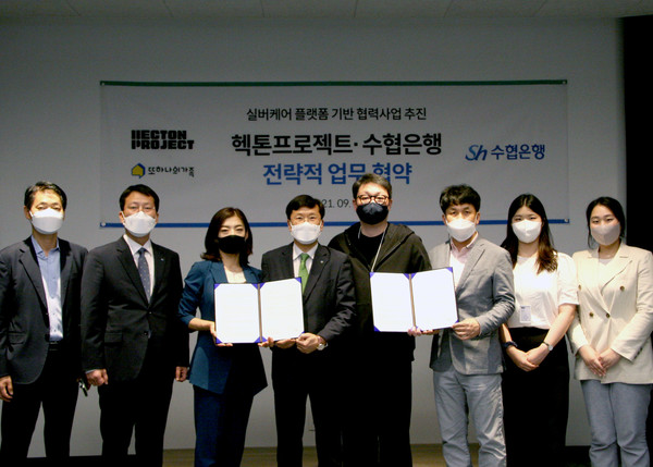 Sh수협은행은 지난 14일, 국내 병원 솔루션 분야 대표 기업인 헥톤프로젝트와 손잡고 실버케어 플랫폼 ‘또하나의가족’에 대한 금융지원 업무협약을 체결했다. GC녹십자헬스케어 계열 헥톤프로젝트는 병원급 EMR(전자의무기록) 솔루션분야 시장 점유율 1위 기업으로, 실버케어 분야의 특화된 정보를 제공하는 ‘또하나의가족’플랫폼 사업도 추진하고 있다.