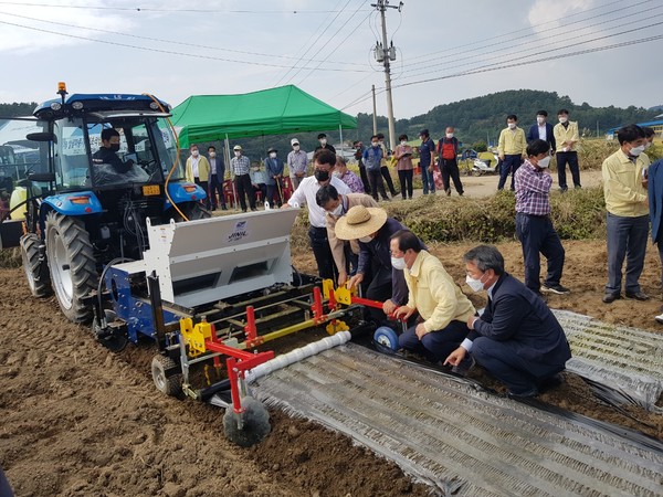 LS엠트론은 최근 고흥에서 MT4모델을 통한 마늘 파종, 두둑성형, 피복작업 시연회를 개최했다.