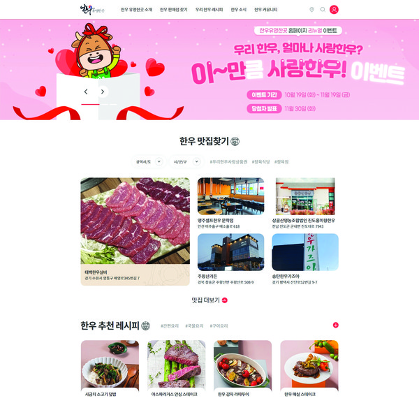 ‘한우 추천 레시피’ 또한 요리 테마와 한우 부위별로 검색할 수 있는 기능을 구축해 편의성을 높였으며 자신만의 한우 레시피를 직접 게시해 공유할 수 있는 ‘나만의 한우레시피’ 코너도 새로 마련했다.