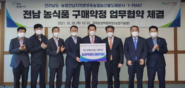 농협전남지역본부(본부장 박서홍)와 전남도(도지사 김영록)는 지난 28일 전남농업기술원 일원에서 열리고 있는 국제농업박람회장에서 전국 농협계통마트와 이마트, 홈플러스, 롯데마트 등 대형마트를 비롯, 홈쇼핑, 온라인 채널 등에 농산물을 공급하는 농협경제지주와 1000억 원의 전남원예농산물 구매약정을 체결했다고 밝혔다.