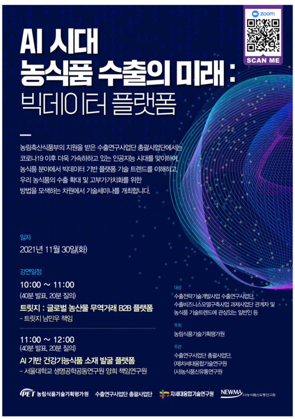 (사)농식품신유통연구원은 오는 30일 온라인으로 ‘AI(인공지능) 시대 농식품 수출의 미래: 빅데이터 플랫폼’을 주제로 ‘2021 농식품수출기술 세미나’를 개최한다.