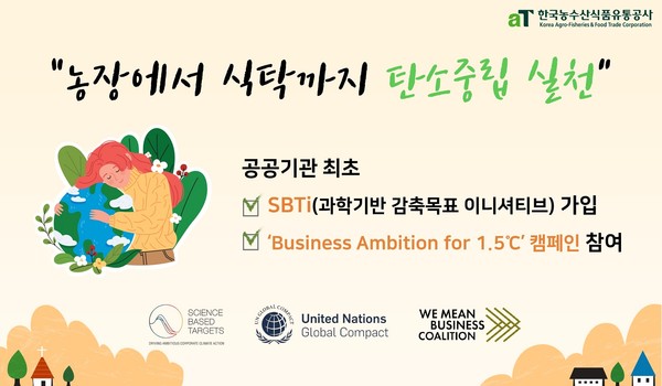 한국농수산식품유통공사(aT)가 국내 공공기관 중 최초로 탄소중립 달성을 위한 글로벌 환경 이니셔티브에 가입하며 실천적 ESG(환경·사회·지배구조)경영 가속화에 나선다.