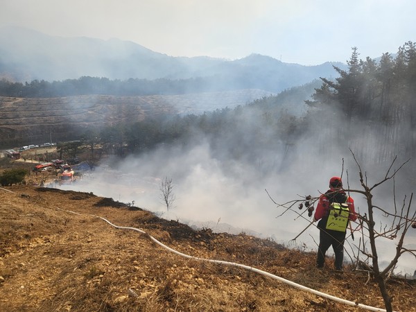 겨울철 건조한 날씨로 전국적으로 크고 작은 산불이 연이어 발생, 소중한 인명과 산림자원의 피해가 급증하고 있어 산불 예방에 각별히 주의가 필요시 되고 있다. 사진은 지난 28일 경남 창원시 의창구 북면 대산리 일원에서 발생한 산불을 진화하고 있는 모습.