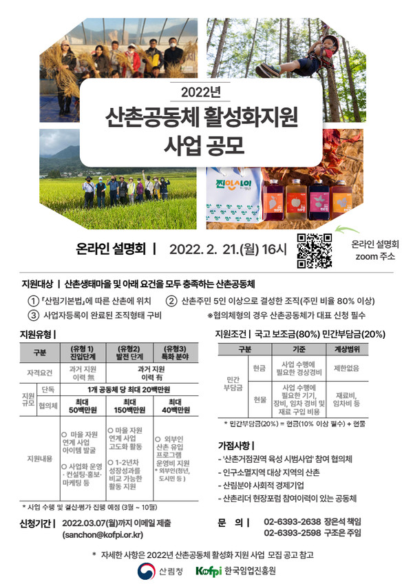 산림청과 한국임업진흥원(원장 이강오)은 다음달 7일까지 ‘2022 산촌공동체 활성화지원 사업’에 참여할 산촌공동체를 모집한다.