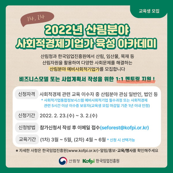 모집 대상과 인원은 산림분야 사회적경제에 관심 있는 일반인, 법인 등을 대상으로 회차당 10명으로 총 20명을 모집할 예정이다.