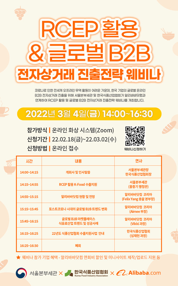 한국식품산업협회는 오는 3월 4일 서울본부세관, 알리바바닷컴과 공동으로 케이-푸드(K-FOOD)수출 지원을 위한 ‘역내포괄적경제동반자협정(RCEP) 활용 및 글로벌 B2B 전자상거래 진출전략 웨비나’를 개최한다.