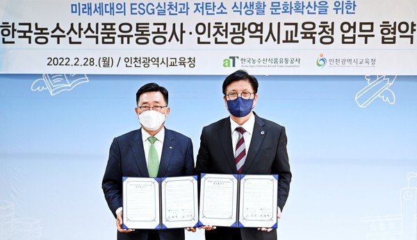 한국농수산식품유통공사(aT)와 인천광역시교육청은 지난 28일 시 교육청에서 업무협약을 체결했다.