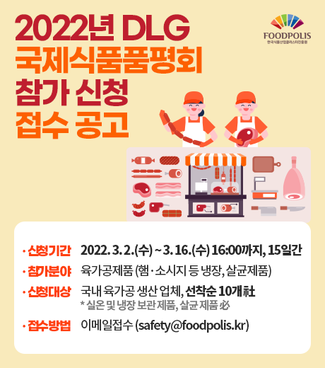 김영재 식품진흥원 이사장은 “독일에서 개최되는 DLG 품평회 참가지원을 통해 국내 육가공 제품에 대한 경쟁력 확보를 위한 장을 마련하겠다”며 “관심 있는 육가공 제조업체의 많은 참여를 기대한다”고 밝혔다.