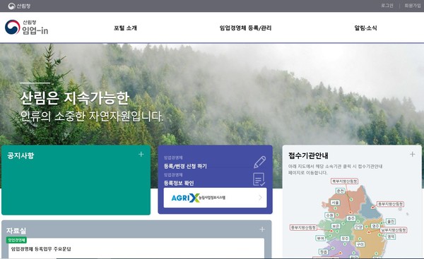 산림청은 지난 7일부터 임업경영체통합포털 ‘입업-in’ 누리집(foco.go.kr)을 통해 임업경영체 등록과 변경을 신청할 수 있는 온라인 서비스를 시작한다고 밝혔다.
