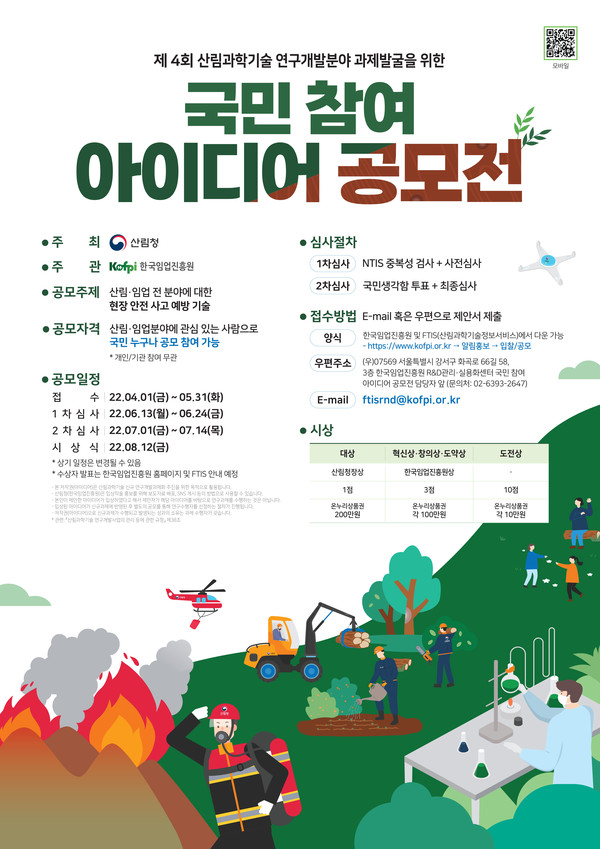이번 산림 과학기술 국민 참여 아이디어 공모전의 주제는 ‘산림·임업 전 분야에 대한 현장·안전사고 예방기술로서 국민의 다양한 의견을 수렴해 우수 아이디어에 대해서는 산림 과학기술 연구과제에 반영할 계획이다.