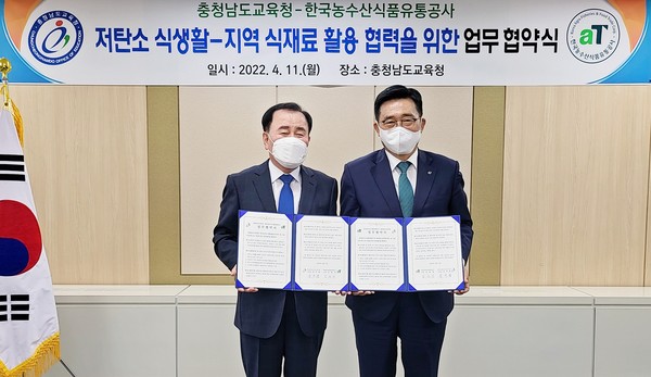aT와 충남도교육청은 11일 교육청에서 업무협약을 통해 △코리아 그린푸드데이 추진 등 환경·사회·지배구조(ESG)가치 실천 △지역 식자재를 활용한 지역 경제 활성화 등에 협력하기로 했다.
