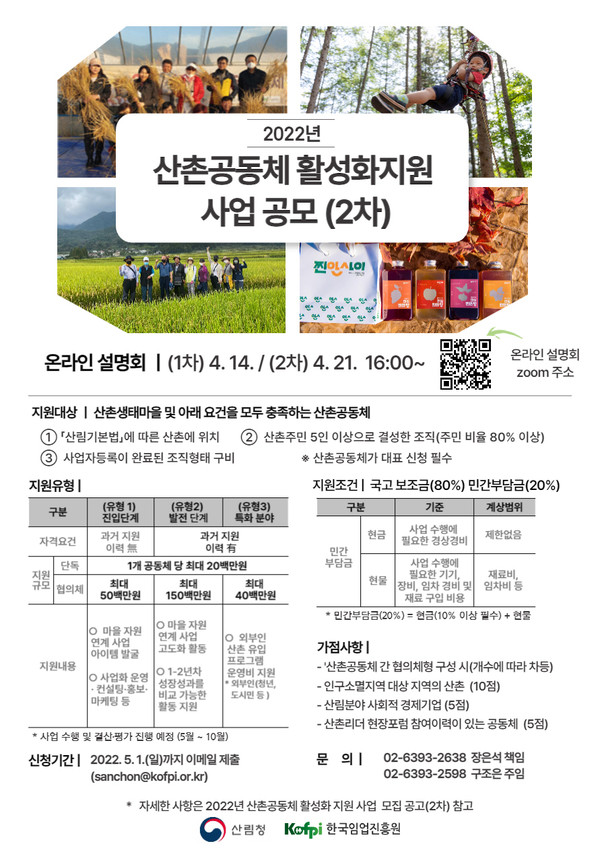 한국임업진흥원(원장 이강오)은 지난 11일부터 다음달 1일까지 ‘2022 산촌공동체 활성화지원 사업(2차)’에 참여할 산촌공동체를 추가 모집한다.